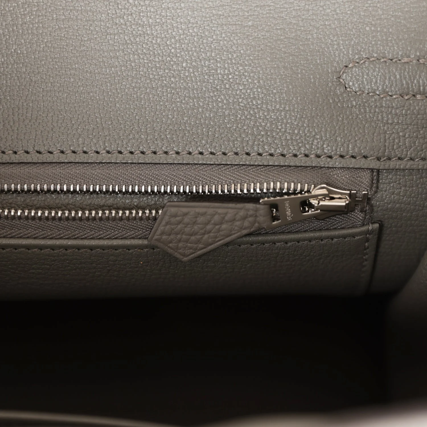 The interior is lined with Gris Meyer chevre and has one zip pocket with an Hermès engraved zipper pull and an open pocket on the opposite side.