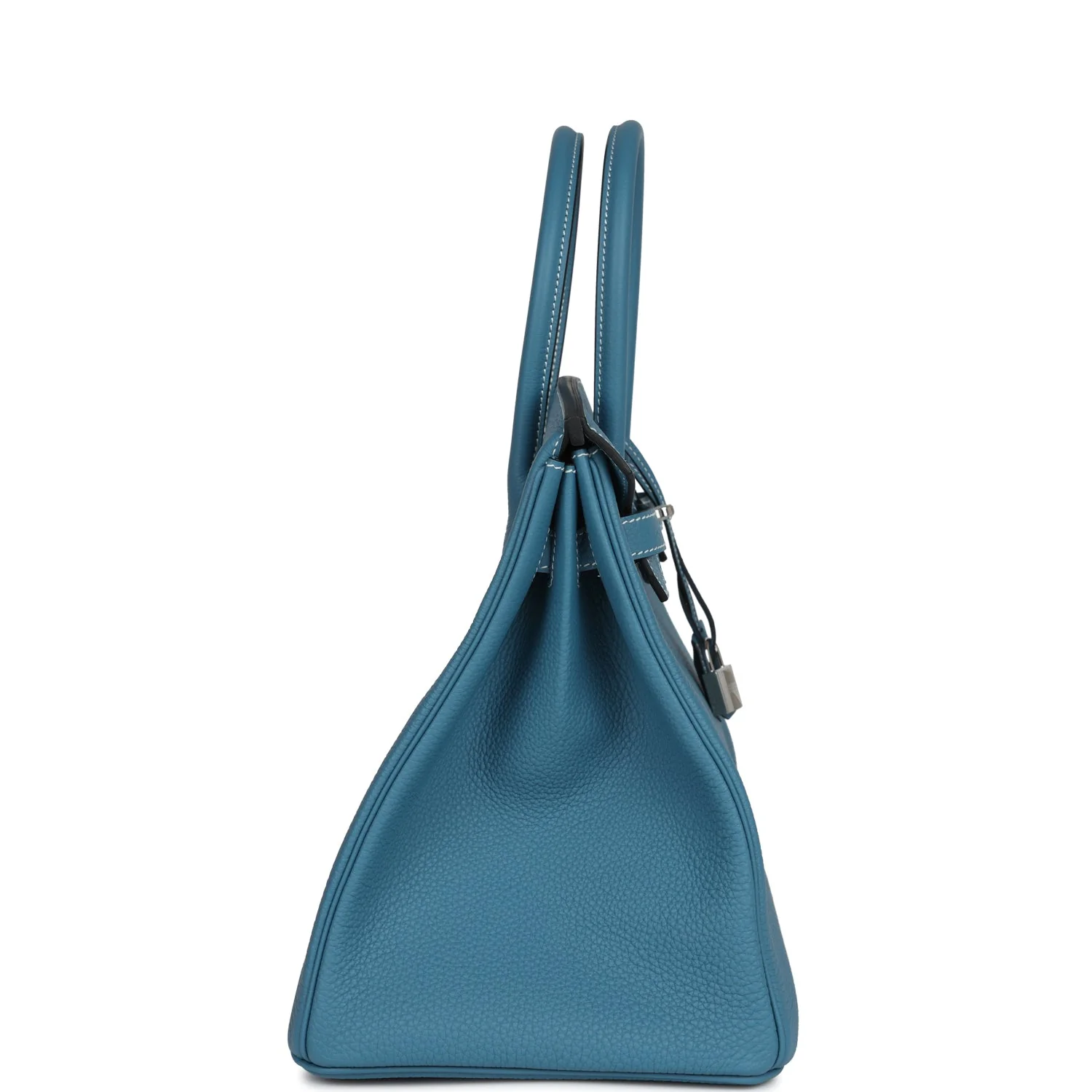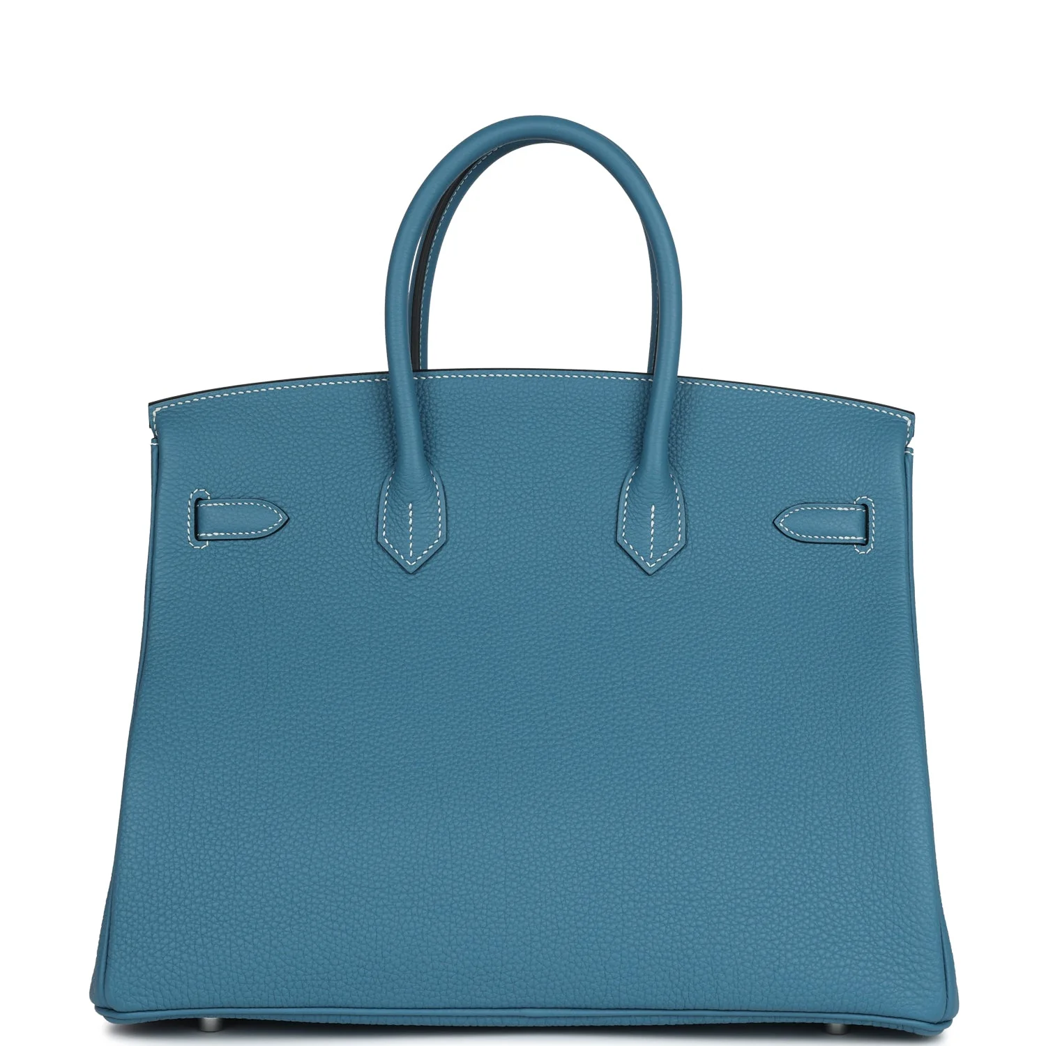 This Birkin is in New Blue Jean togo leather with palladium hardware and has white contrast stitching, front flap, two straps with center toggle closure, clochette with lock and two keys, and double rolled handles.