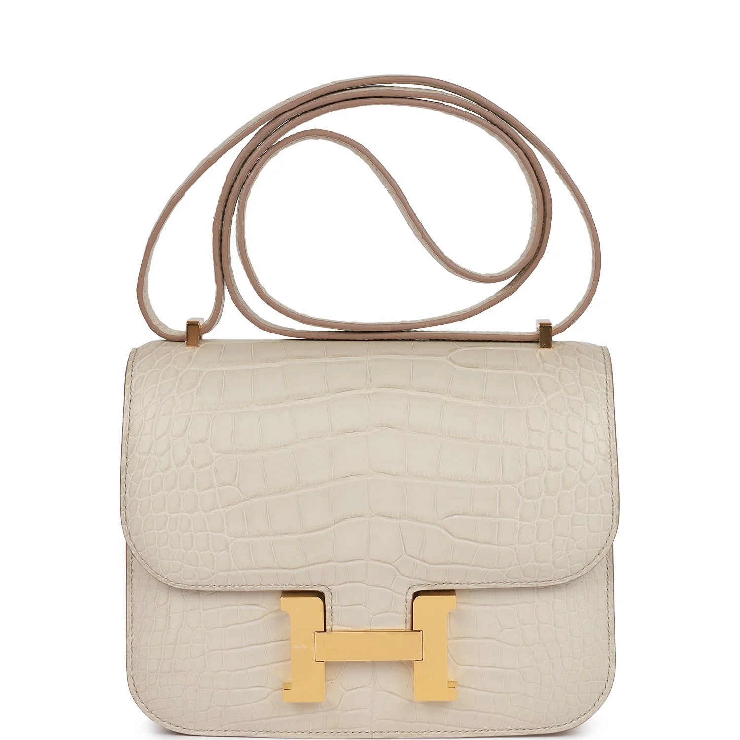 This Constance is of Beton matte alligator with gold hardware and features tonal stitching, a "H" snap lock closure, and an adjustable shoulder strap.