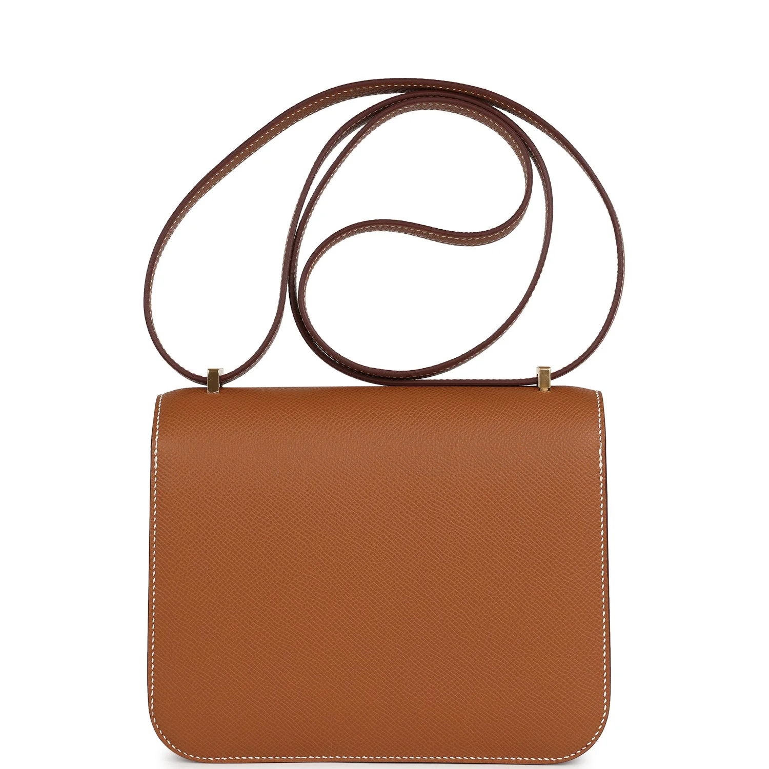 This Constance 1-18 is in Gold epsom leather with gold hardware and has contrast stitching, a metal "H" snap lock closure and adjustable shoulder strap.