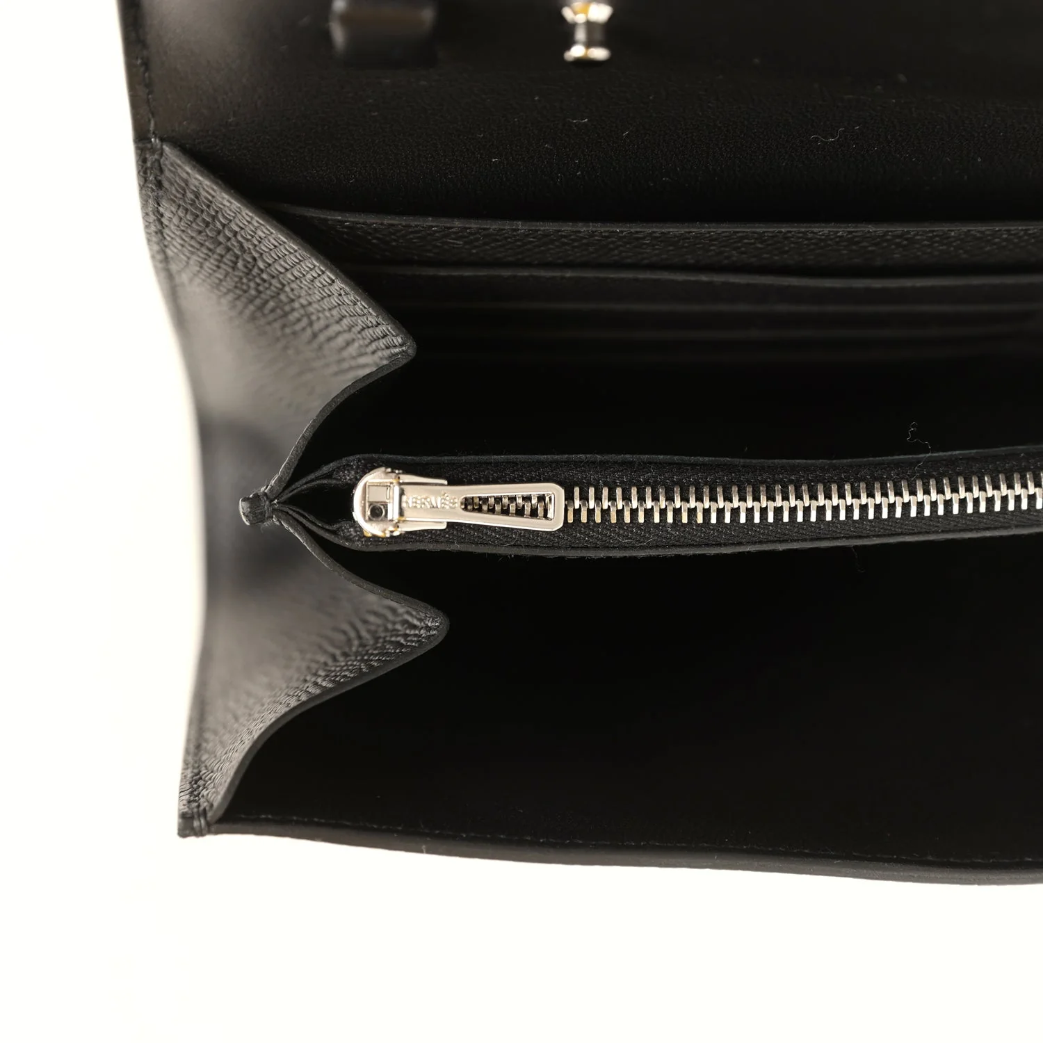 The interior is lined with Black epsom leather and has two main compartments with six credit card slots and a zippered center compartment with Hermès H lock pull.