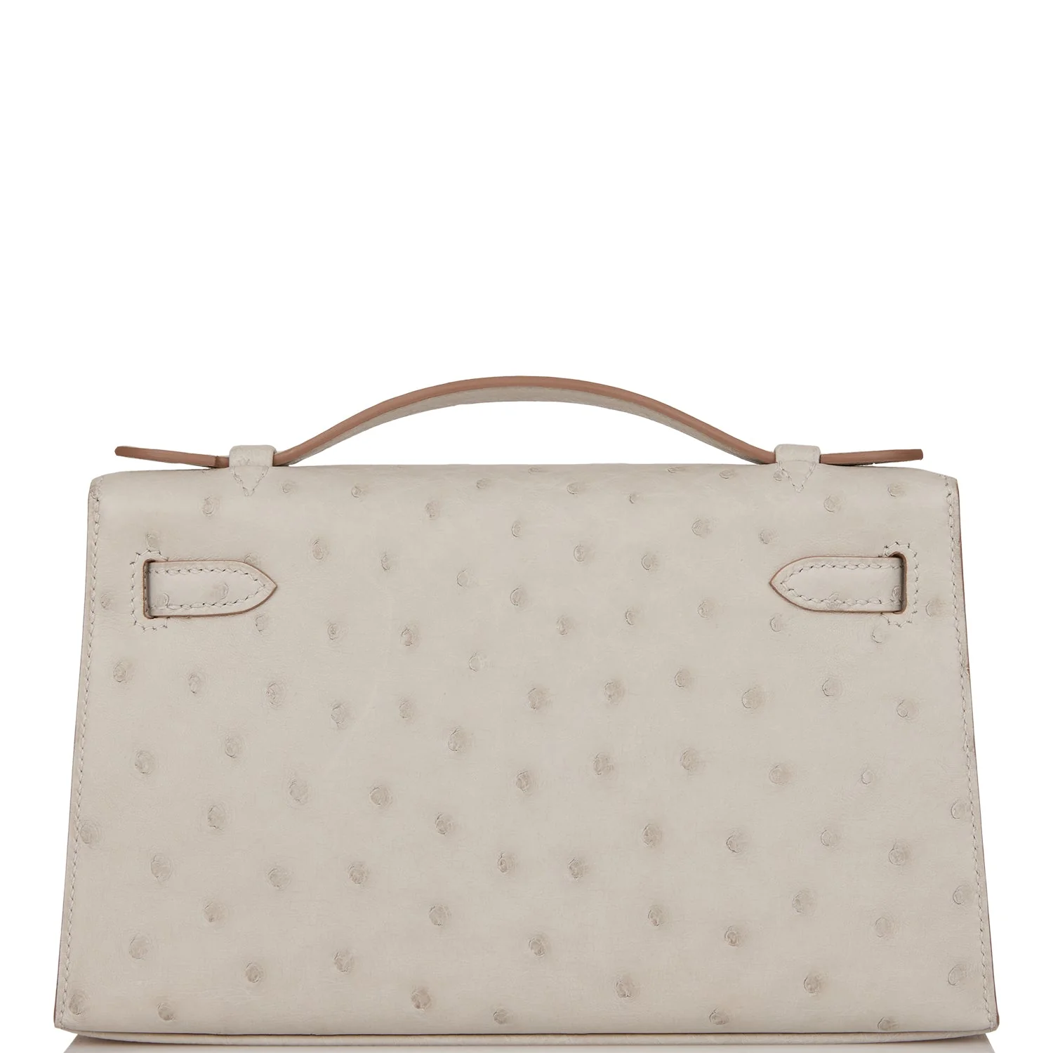This Mini Kelly Pochette is in Gris Perle ostrich with gold hardware and has tonal stitching, front flap, two straps with center toggle closure and a top flat handle.