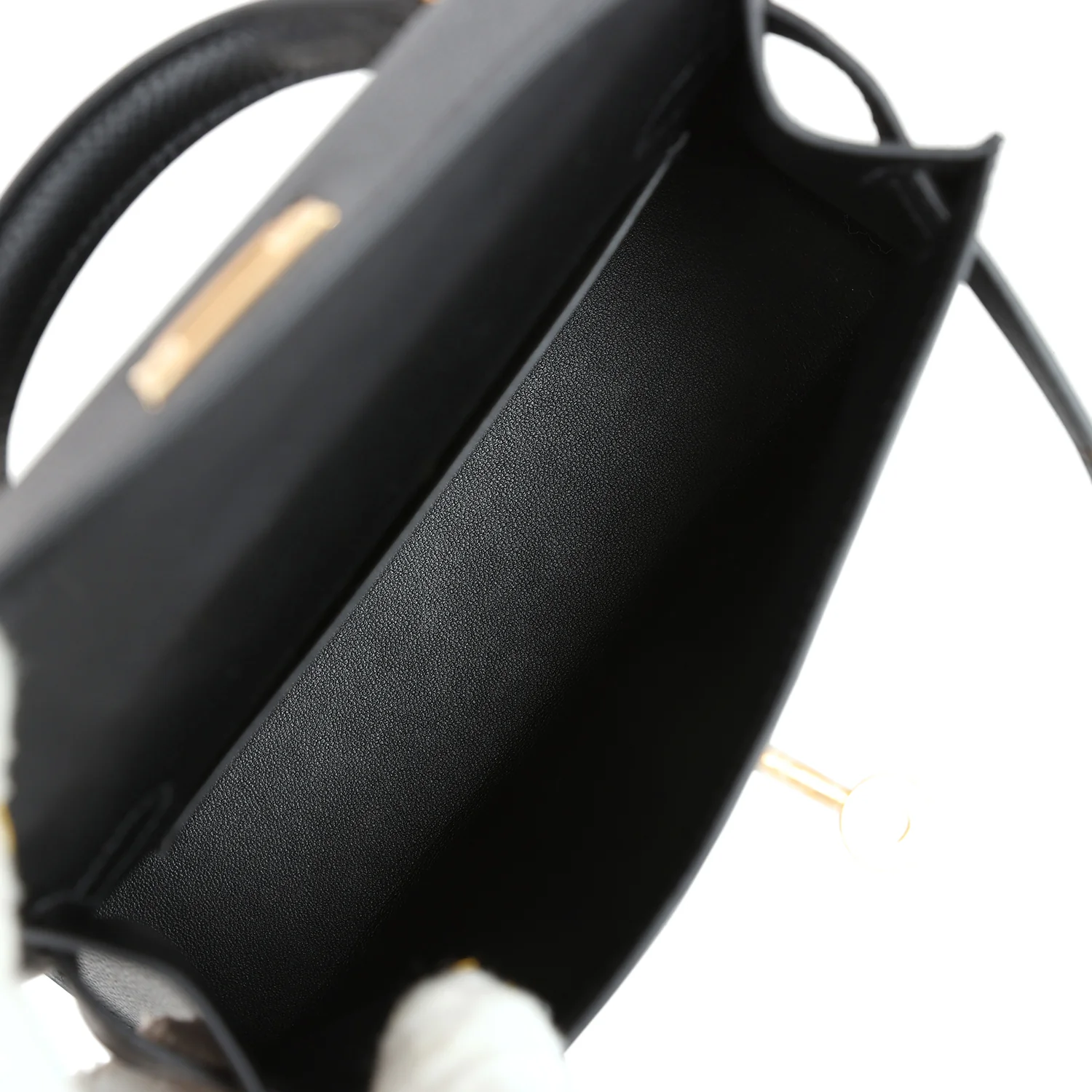 The interior is lined with black lambskin leather and has one open pocket on the back wall.
