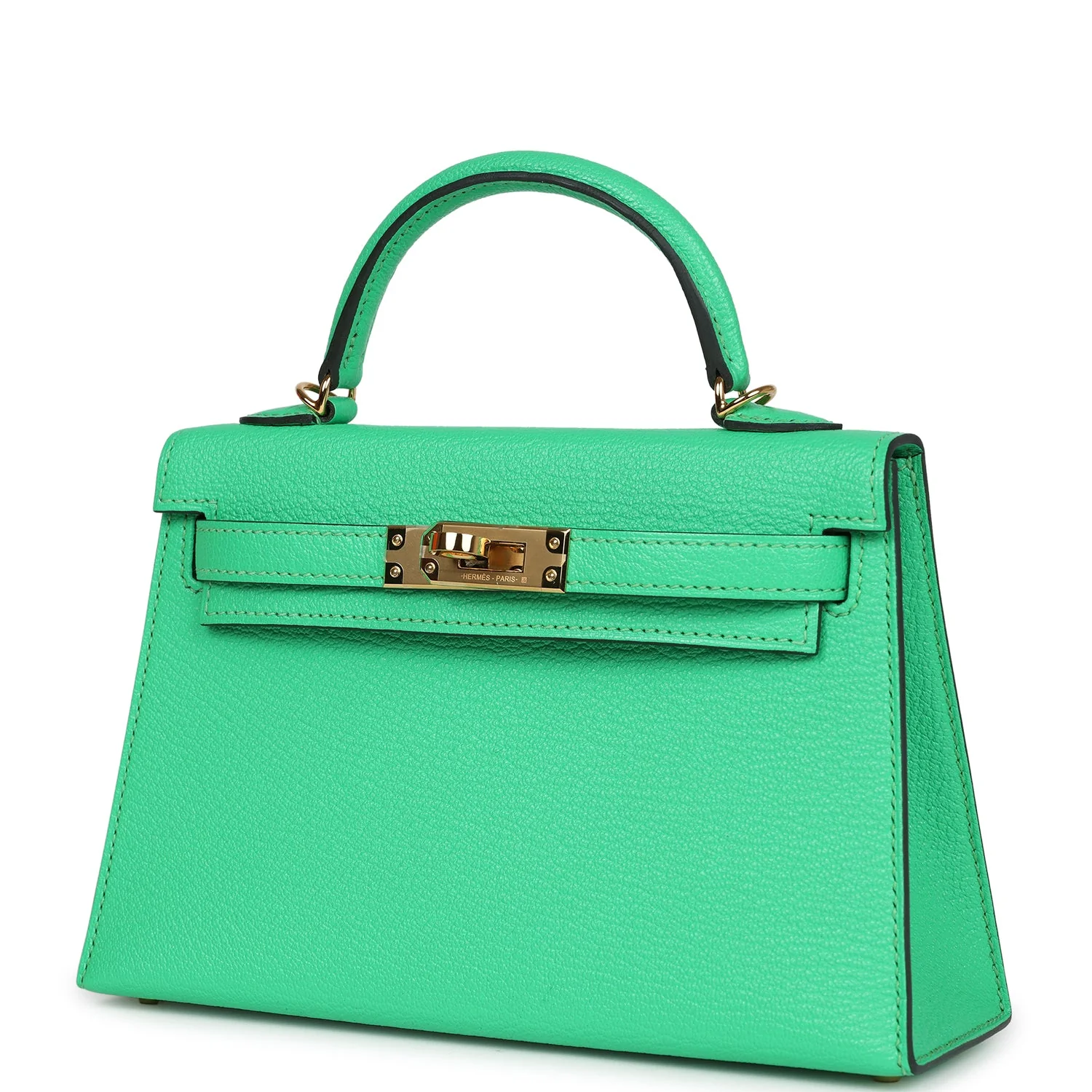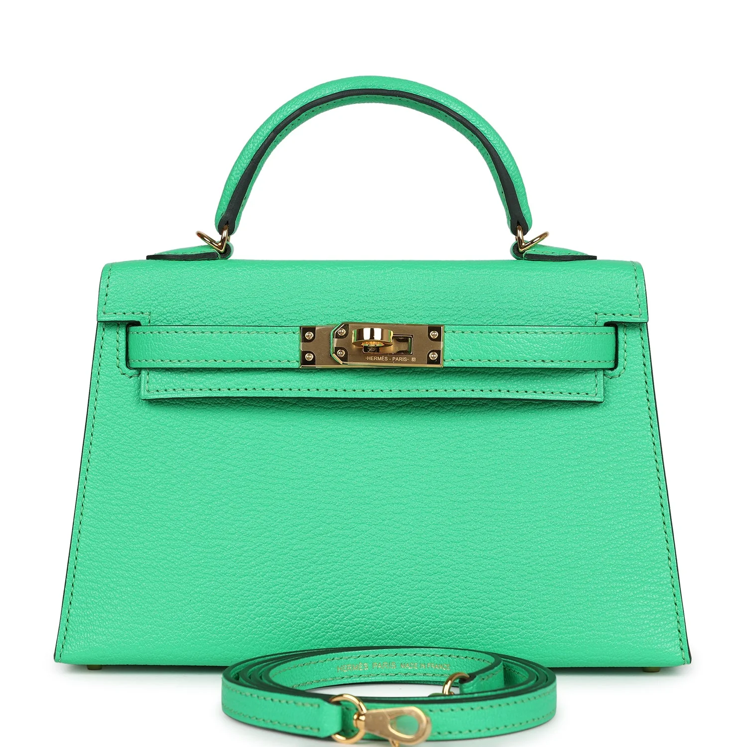 This tiny Kelly is in Vert Comics chevre mysore leather with gold hardware and has tonal stitching, two front straps with front toggle closure, single rolled handle and removable shoulder strap.