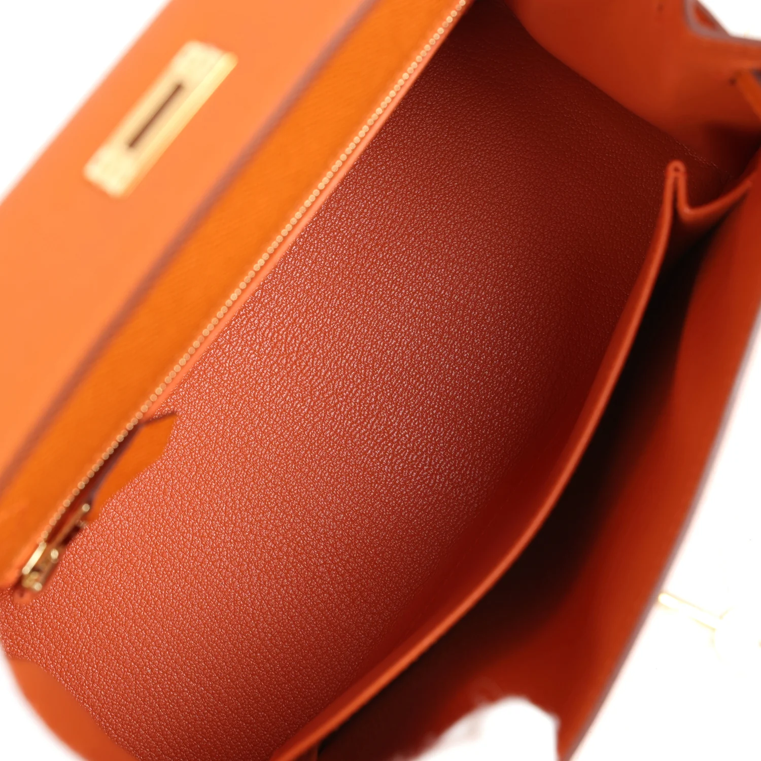 The interior is lined with Orange chevre leather and has one zip pocket with an Hermes engraved pull and one open pocket on the opposite side.