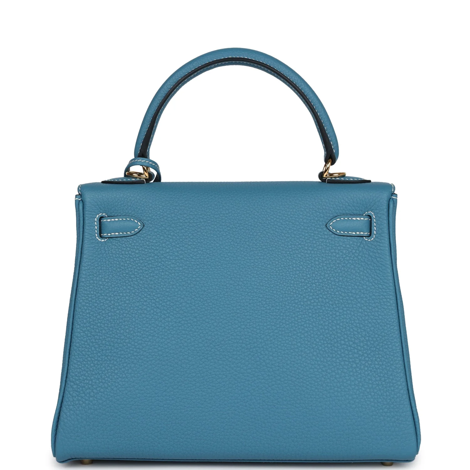 This Kelly, in the Retourne style, is in New Blue Jean togo leather with gold hardware and has contrast stitching,front flap, two straps with center toggle closure, clochette with lock and two keys, single rolled handle and removable shoulder strap.