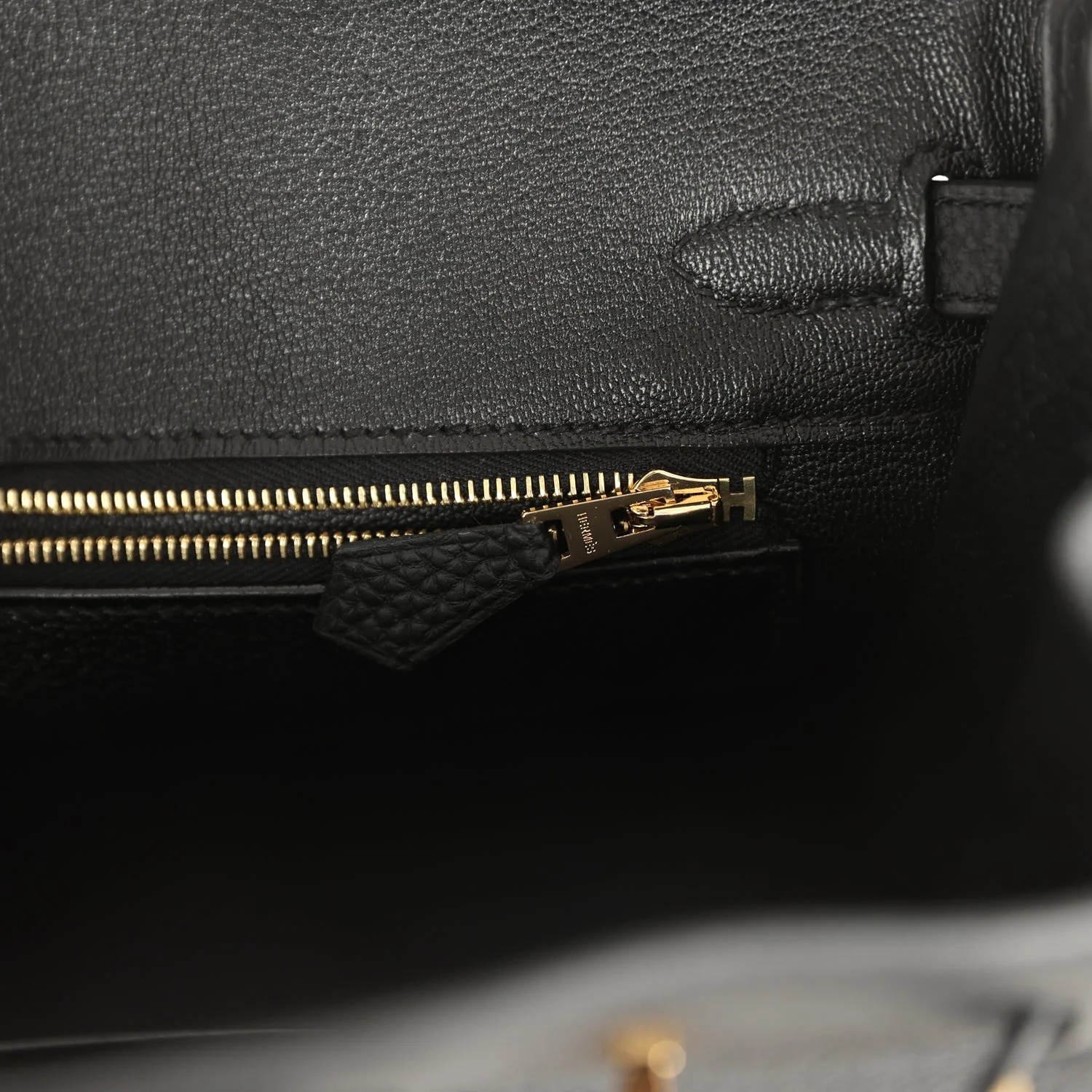 The interior is lined with Black chevre and has a zip pocket with an Hermès engraved zipper pull and an open pocket on the opposite side.