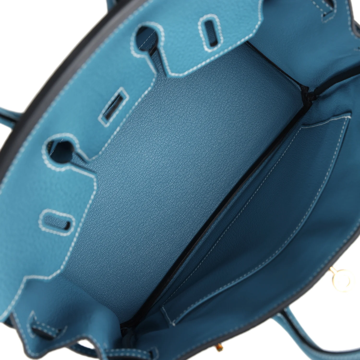The interior is lined with Blue Jean chevre, has one zip pocket with an Hermès engraved zipper pull and an open pocket on the opposite side.