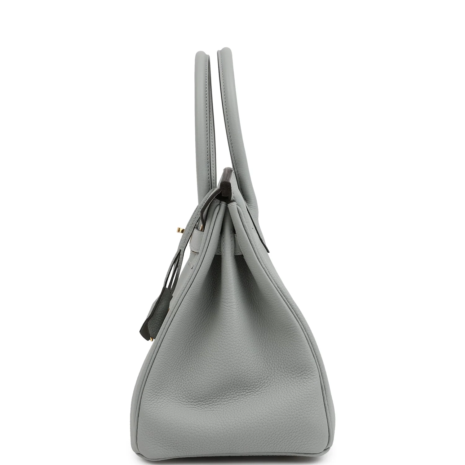 This Birkin is in Bleu Glacier togo leather with gold hardware, featuring tonal stitching, front flap with two straps, front toggle closure, clochette with lock and two keys, and double rolled handles.