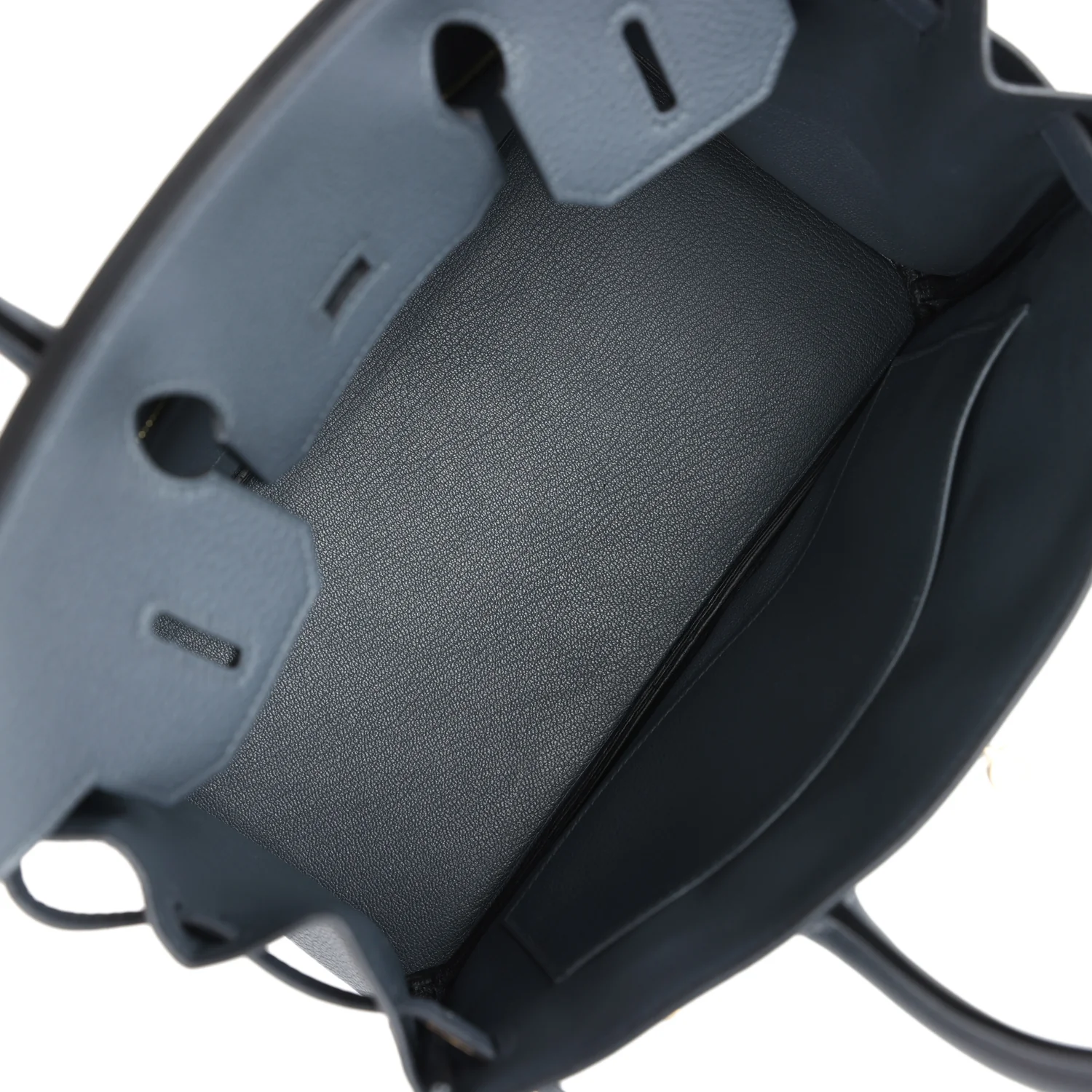 The interior is lined with Gris Misty chevre and has one zip pocket with an Hermes engraved zipper pull and an open pocket on the opposite side.