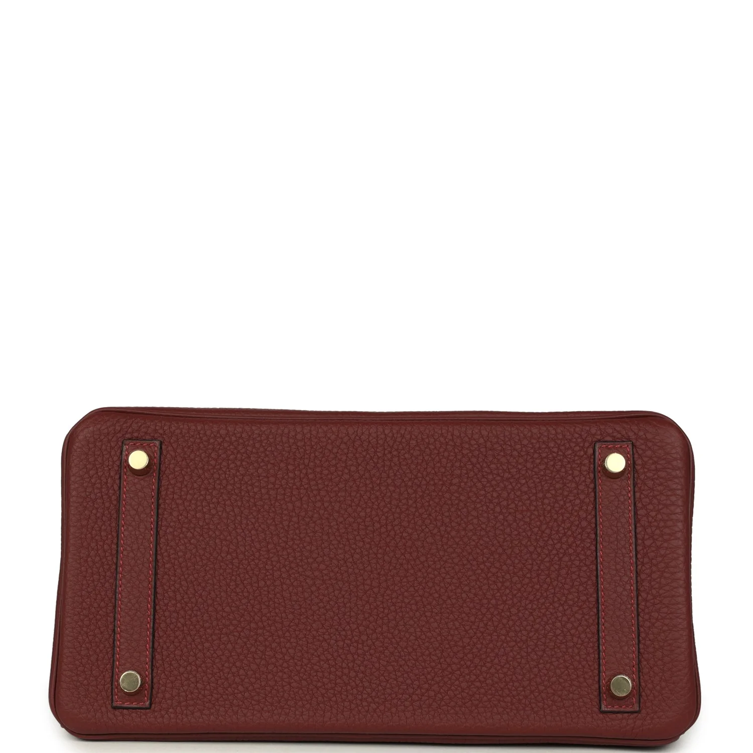 This Birkin is in Rouge H togo leather with gold hardware and has tonal stitching, front flap, two straps with center toggle closure, clochette with lock and one key, and double rolled handles.