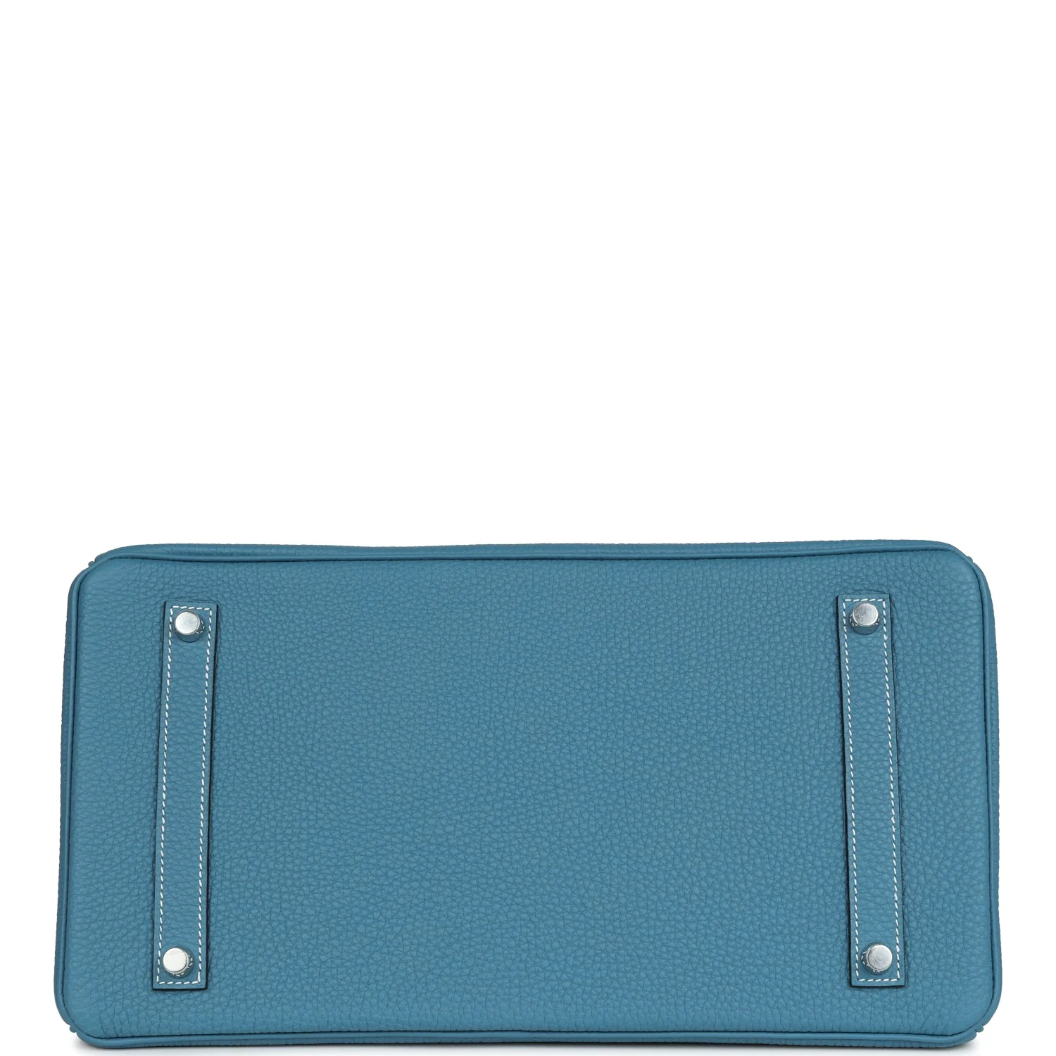 This Birkin is in New Blue Jean togo leather with palladium hardware and has white contrast stitching, front flap, two straps with center toggle closure, clochette with lock and two keys, and double rolled handles.