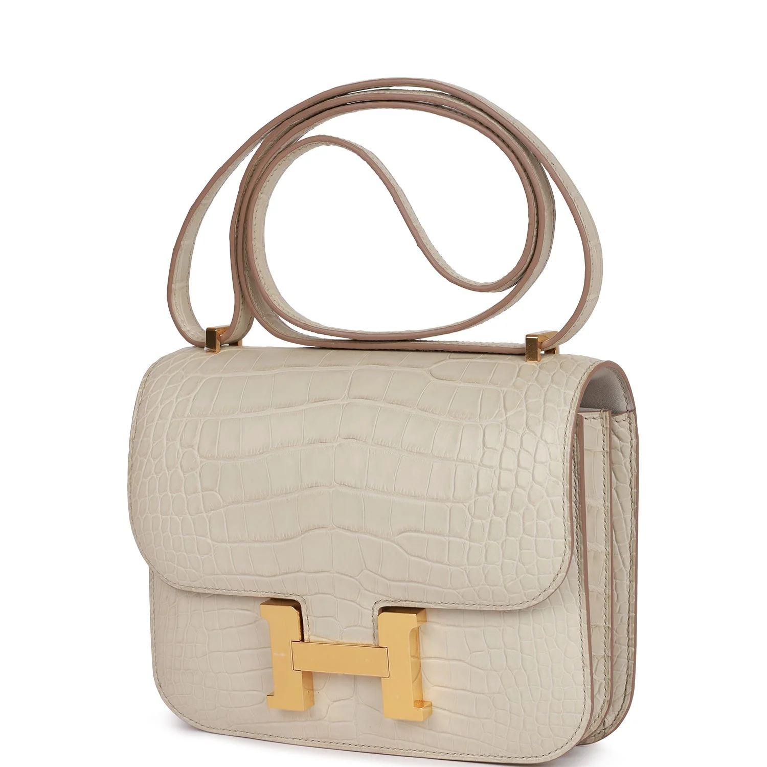 This Constance is of Beton matte alligator with gold hardware and features tonal stitching, a "H" snap lock closure, and an adjustable shoulder strap.