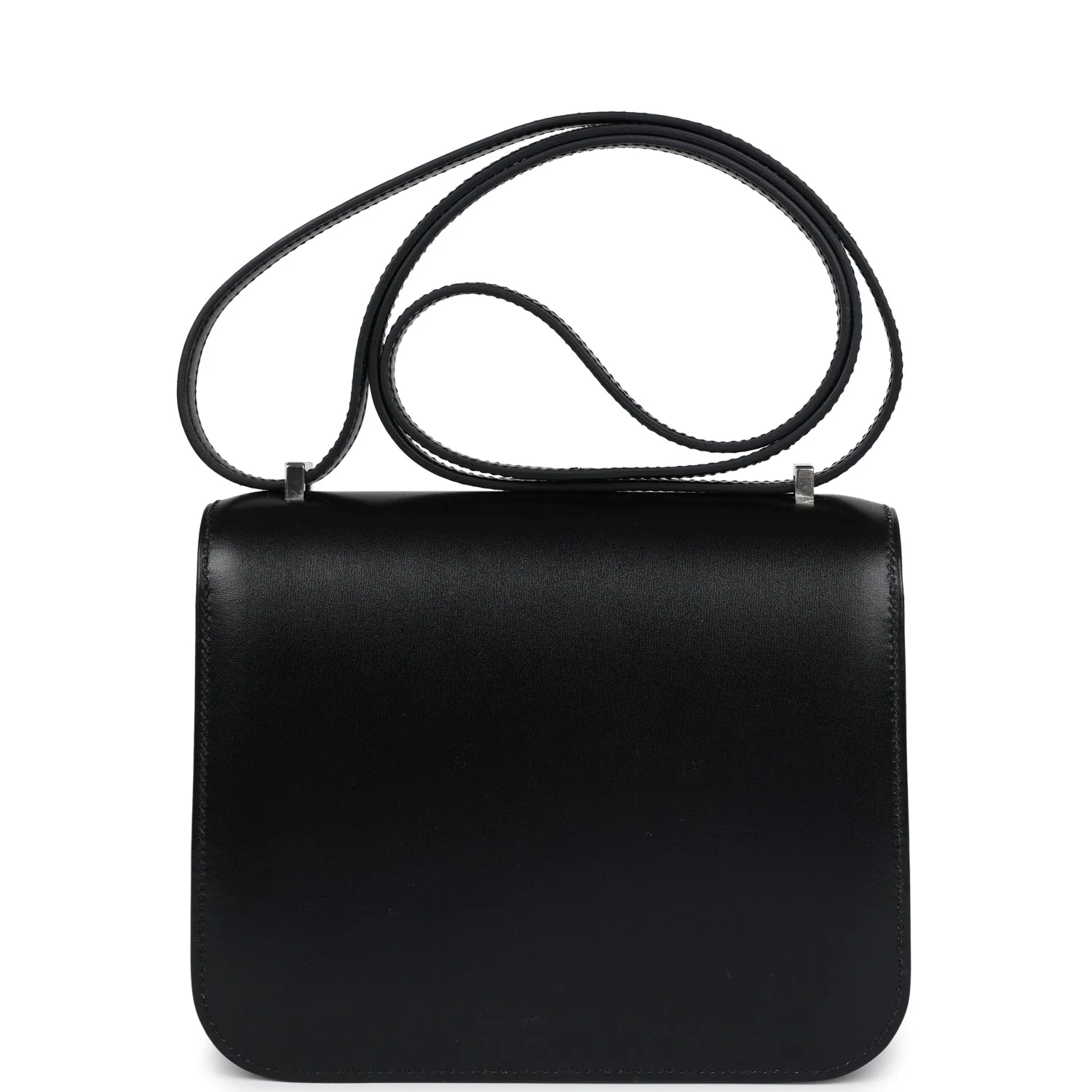 This Constance is in Black box calf leather with palladium hardware and has tonal stitching, a metal "H" snap lock closure and adjustable shoulder strap.