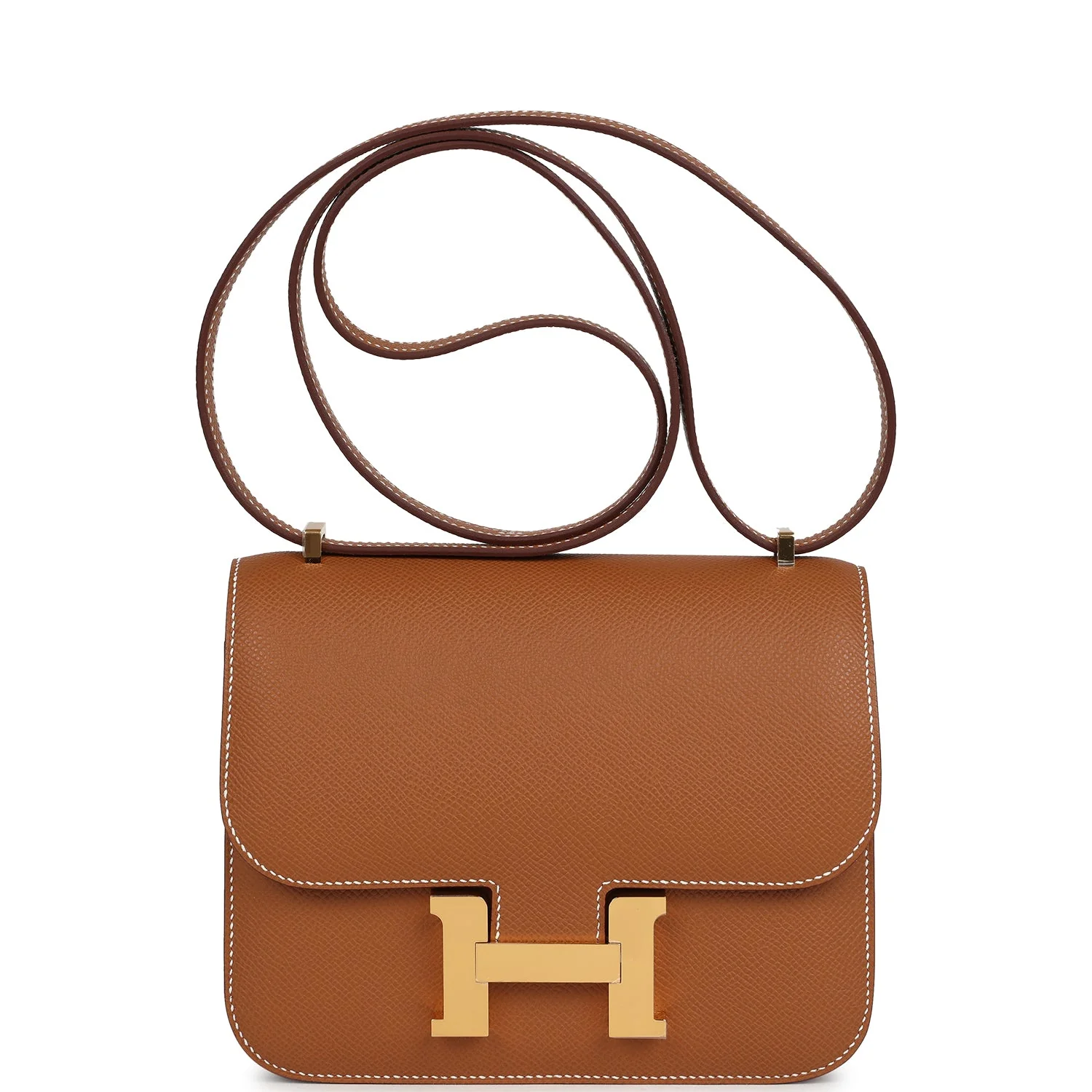 This Constance 1-18 is in Gold epsom leather with gold hardware and has contrast stitching, a metal "H" snap lock closure and adjustable shoulder strap.