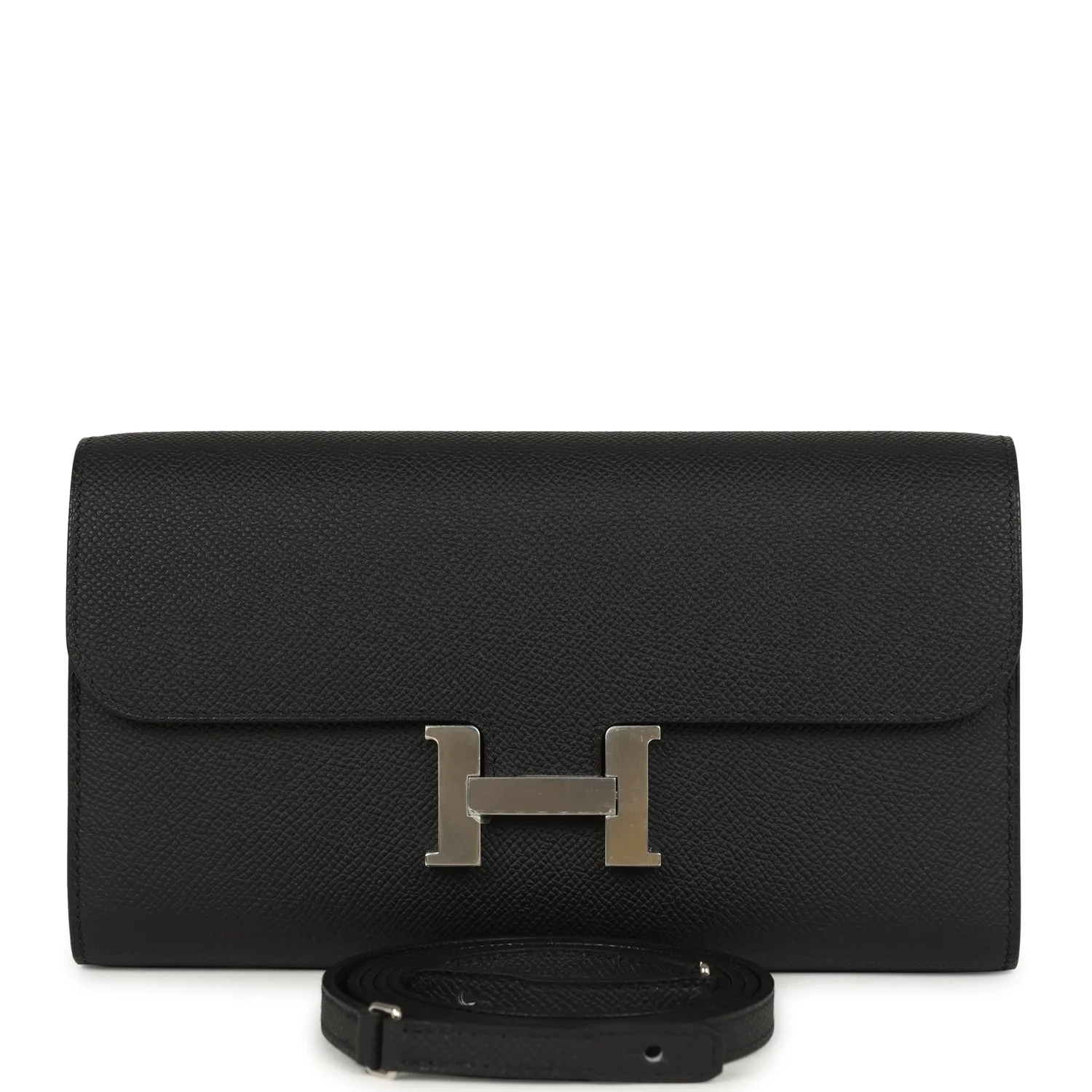 This Hermès Constance Wallet To Go is in Black epsom leather with palladium hardware and has tonal stitching, metal "H" snap lock closure, open front compartment and removable crossbody strap.