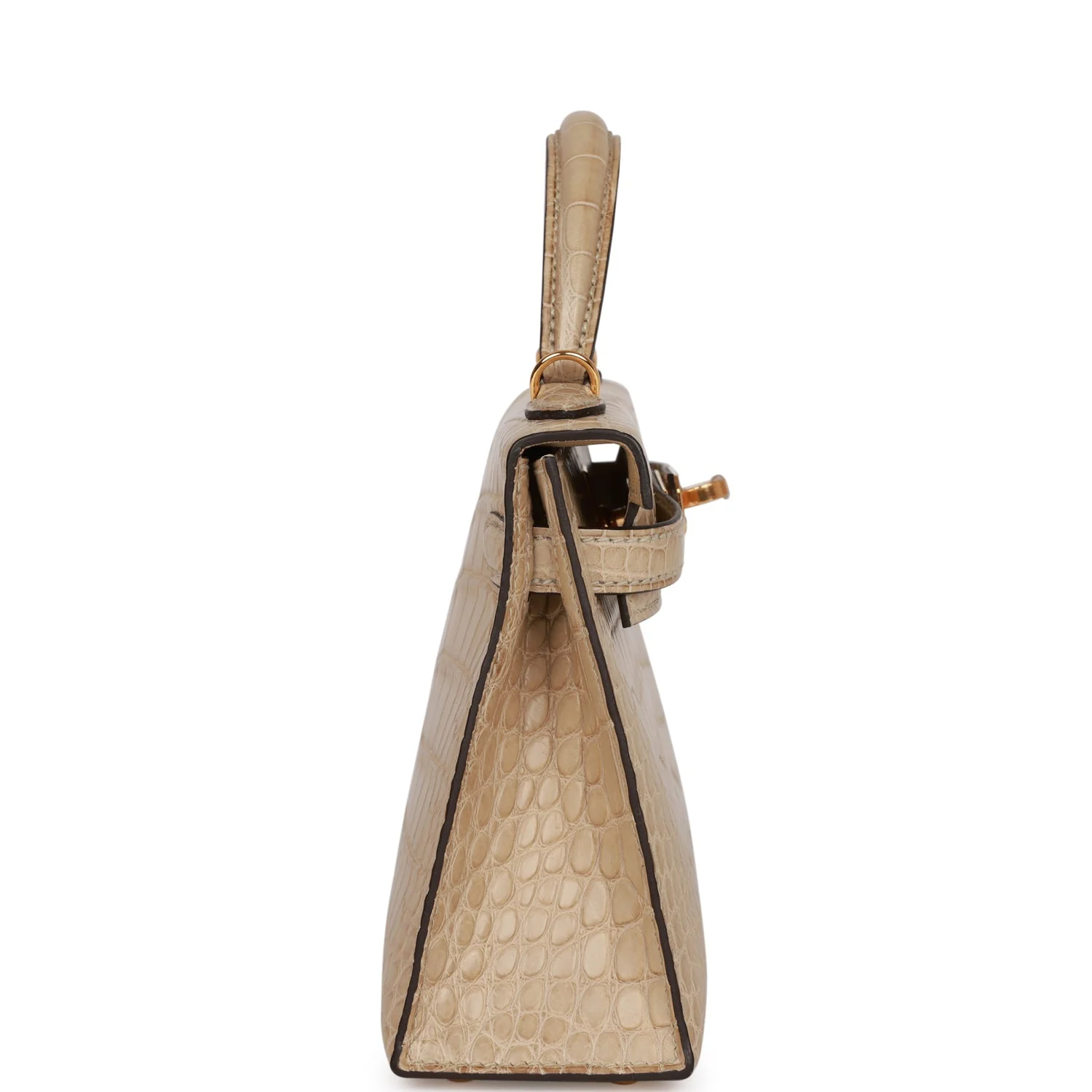 This mini Kelly is in Trench matte alligator mississippiensis with gold hardware and has tonal stitching, two front straps with front toggle closure, single rolled handle and removable shoulder strap.