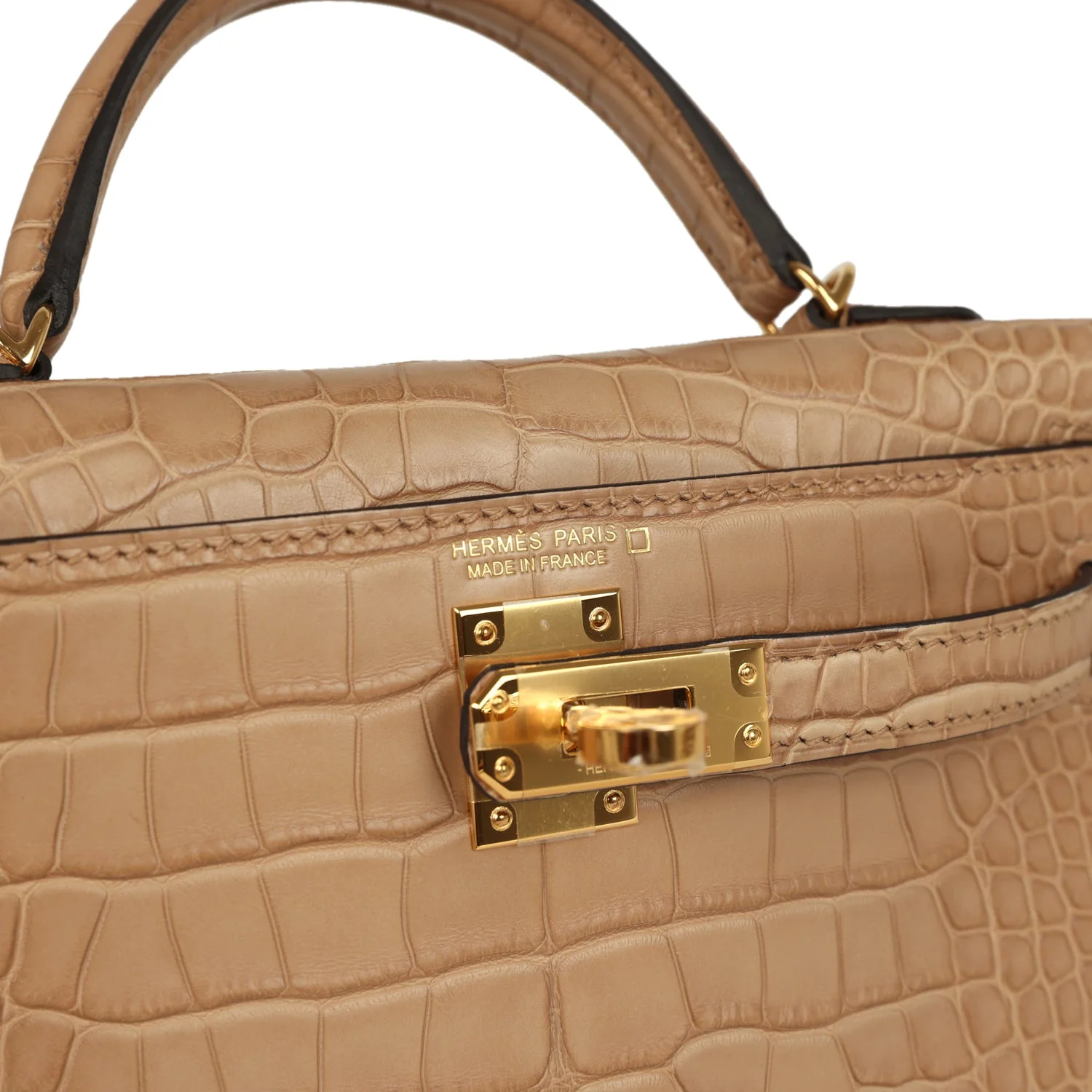 This Kelly, in the Sellier style, is in Chai Matte Alligator Mississippiensis leather with gold hardware and has tonal stitching, two straps with front toggle closure, single rolled handle and removable shoulder strap.