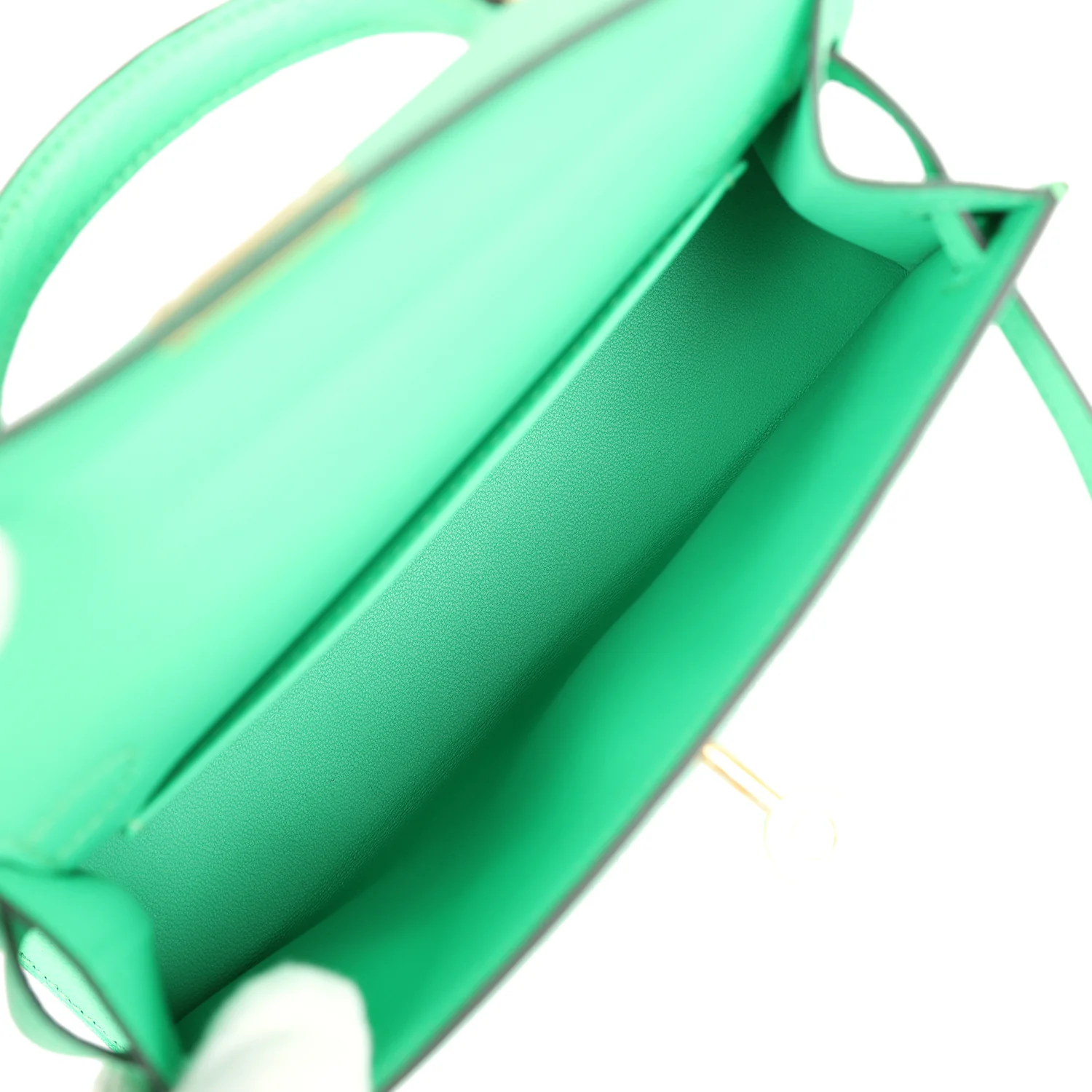 This tiny Kelly is in Vert Comics chevre mysore leather with gold hardware and has tonal stitching, two front straps with front toggle closure, single rolled handle and removable shoulder strap.