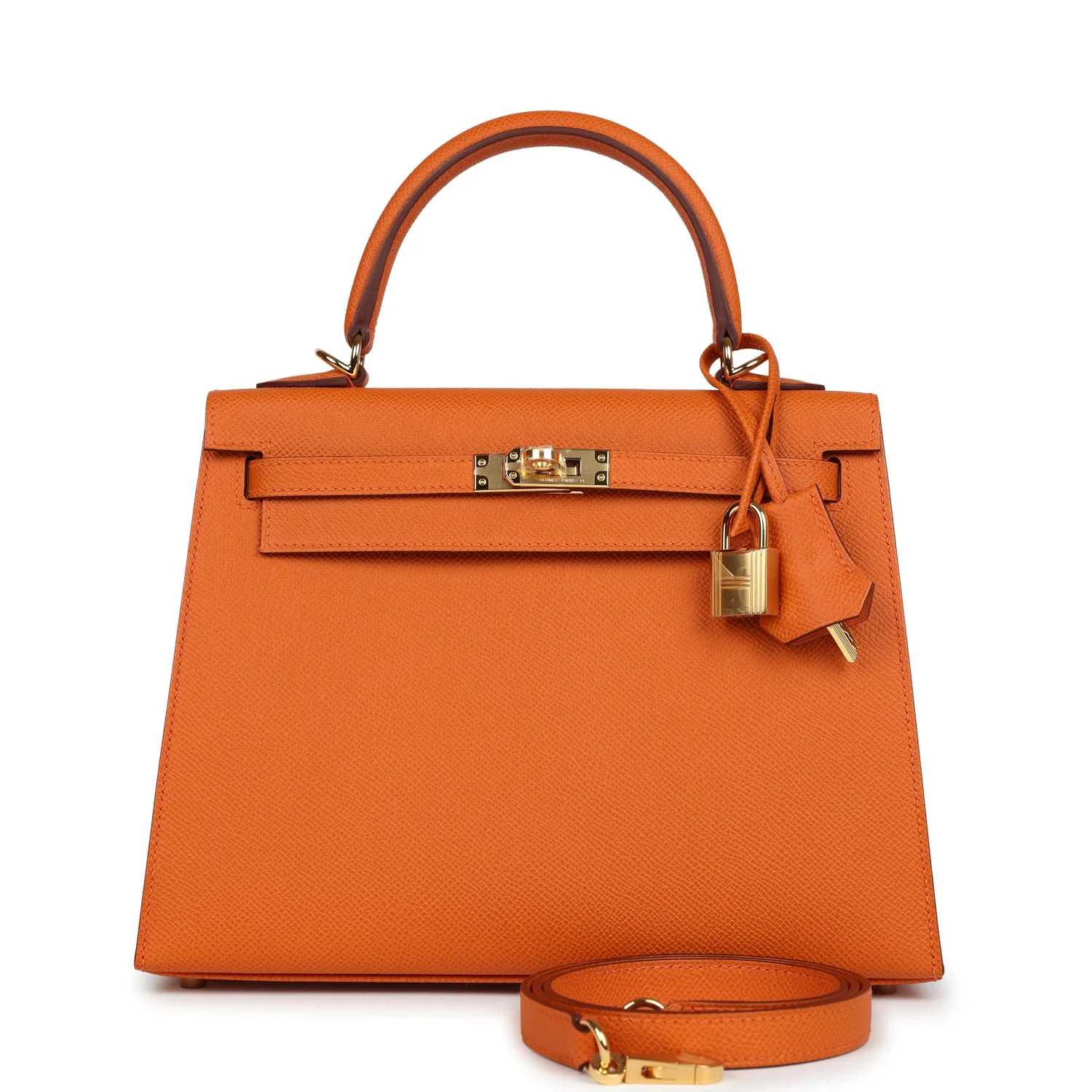 This Kelly, in the Sellier style, is in Orange epsom leather with gold hardware and has tonal stitching, two straps with front toggle closure, clochette with lock and two keys, single rolled handle and removable shoulder strap.