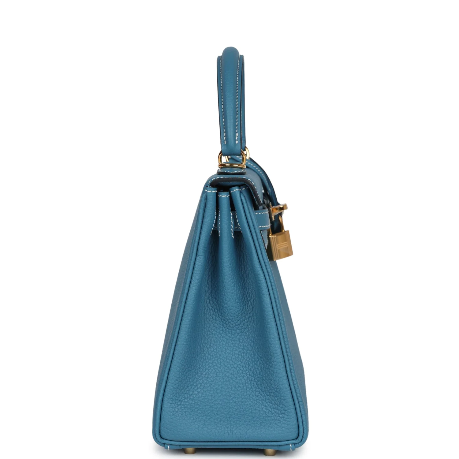 This Kelly, in the Retourne style, is in New Blue Jean togo leather with gold hardware and has contrast stitching,front flap, two straps with center toggle closure, clochette with lock and two keys, single rolled handle and removable shoulder strap.